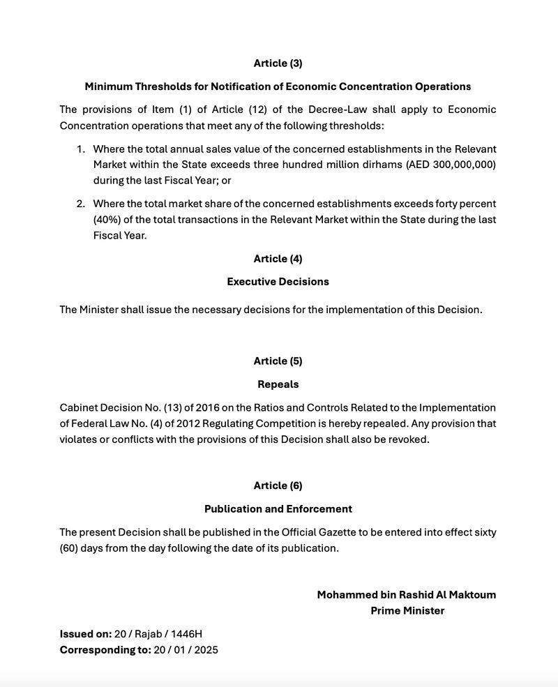 Against this backdrop, Cabinet Decision No. (3) of 2025 on the Ratios Related to the Implementation of Federal Decree-Law No. (36) of 2023 Regulating Competition requires prior notification to the Authorities where: